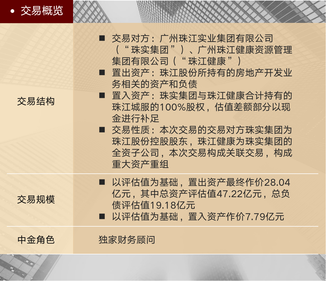 通过本次交易,珠江股份将原有房地产业务资产置出,同时置入行业前景良好的物业管理与文体运营资产,实现业务转型,提升盈利能力。本次项目将在完成后成为首单地方国有A股上市房地产企业通过重大资产置换实现主业变更的项目。本次交易是中金助力地方国企化解风险,实现高质量发展的又一经典案例,也是中金响应国家政策号召,促进房地产业平稳健康发展,服务稳定宏观经济大盘的切实体现。
