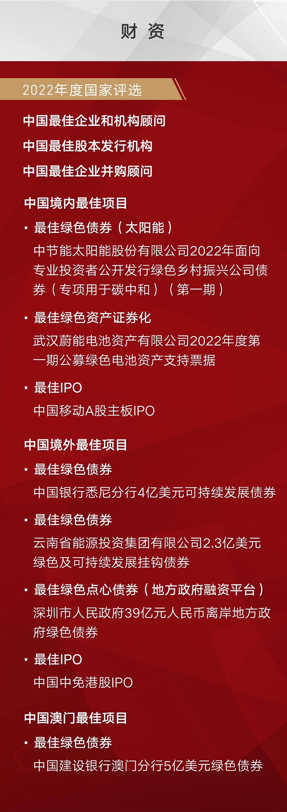 此外,由中金主导和参与的项目也在评选中大有斩获,赢得最佳IPO、最佳绿色债券、最佳绿色资产证券化等多个项目类奖项。