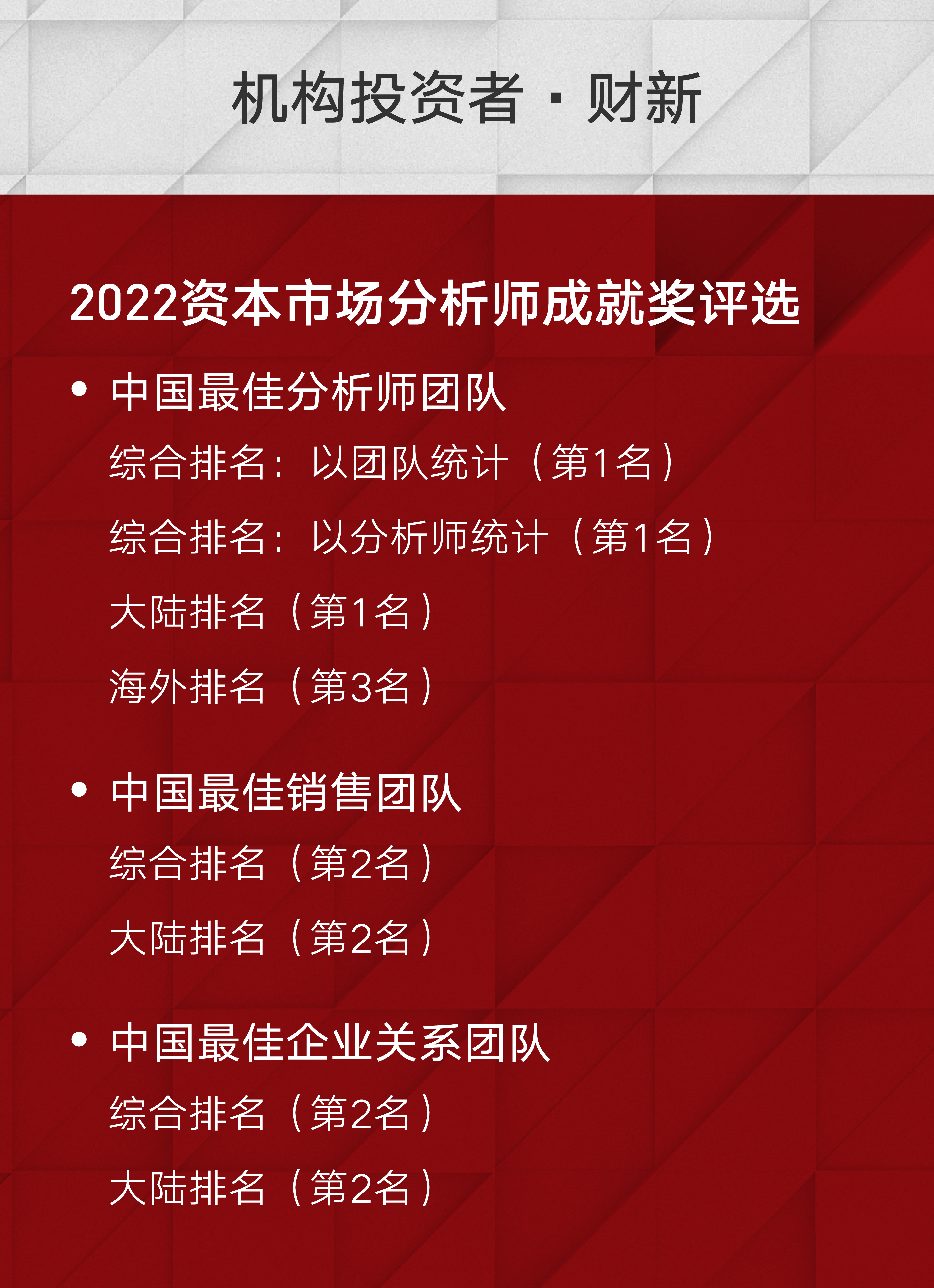 中金在机构投资者•财新2022资本市场分析师成就奖评选中再次荣获多项大奖