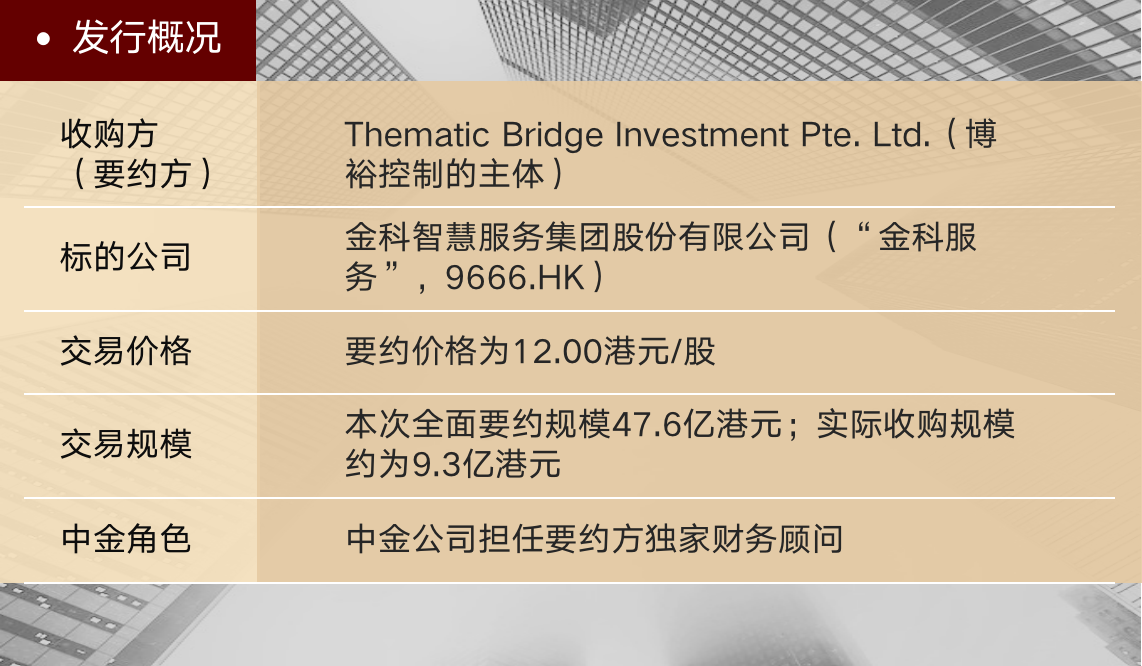 近日,中金公司协助博裕投资(“博裕”)以自愿性有条件全面现金要约方式增持金科智慧服务集团股份有限公司(“金科服务”,9666.HK)并成为第一大股东的交易已成功实施。本次交易前,博裕持有金科服务22.69%股权,本次交易完成后,博裕持有金科服务34.63%股权。本次交易中,中金公司担任博裕的独家财务顾问。