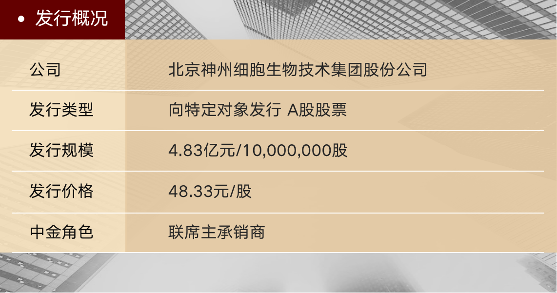 北京神州细胞生物技术集团股份公司(以下简称“神州细胞”或“公司”,代码:688520.SH)于2022年11月10日完成向特定对象发行A股股票,发行价格48.33元/股,发行规模4.83亿元。本次向特定对象发行A股股票是神州细胞上市后的首次股权融资,也是科创板首单未盈利生物医药企业再融资项目。中金公司担任本项目的联席主承销商。