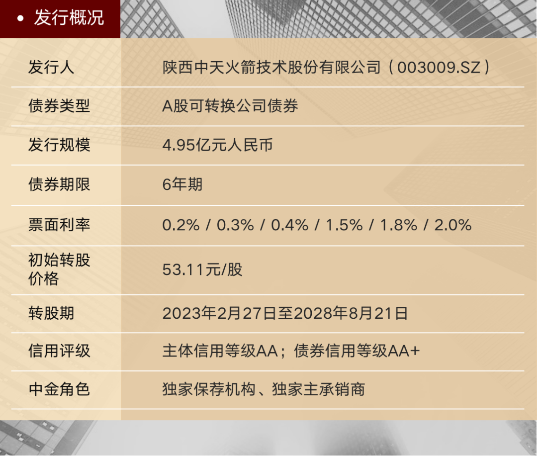 9月19日,陕西中天火箭技术股份有限公司(以下简称“中天火箭”或“公司”,代码:003009.SZ)深交所主板公开发行A股可转换公司债券成功上市,发行规模为4.95亿元人民币。中金公司担任本项目的独家保荐机构、独家主承销商。