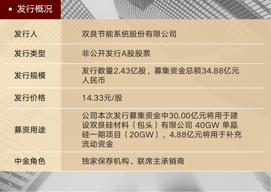 借助本次发行,双良节能将推进大尺寸光伏单晶硅建设,完善光伏产业链布局,助力绿色低碳能源发展,践行“碳达峰、碳中和”的战略目标。