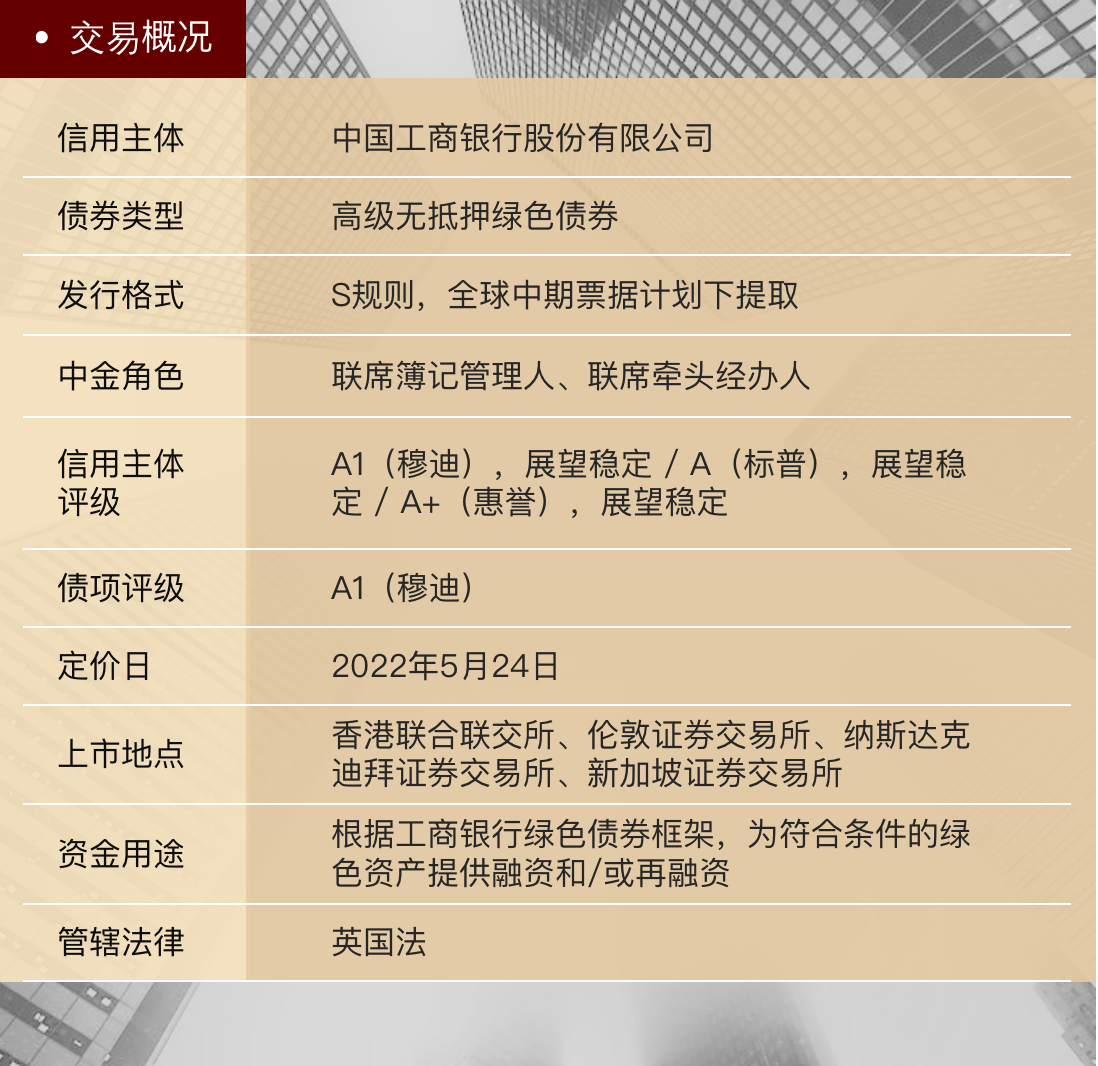 5月24日,中国工商银行股份有限公司(“工商银行”或“公司”,穆迪A1/标普A/惠誉A+)境外多家分行成功发行全球多币种“碳中和”主题境外绿色债券(“本次发行”),债项评级均为穆迪A1。中金公司参与了全部的五笔发行,并在其中担任联席簿记管理人、联席牵头经办人角色。