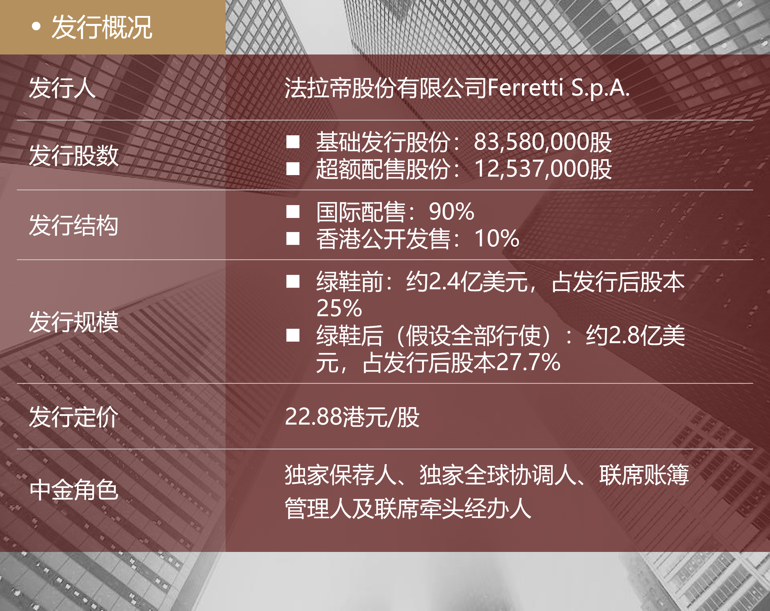中金公司凭借强大的国际化能力和创新执行力,在香港疫情爆发和横跨多个假期的情况下,协助法拉帝申报后三个月高效完成发行,并实现了多个史无前例的创新突破。在当下国际社会和资本市场复杂严峻的环境中,中金公司协助法拉帝深入挖掘其公司价值,帮助公司成功实现逆市高质量发行,整体配售欧美和中东投资者占比超60%,主权基金及长线基金占比超65%,是配售结构最国际化、配售质量最高的港股IPO之一。