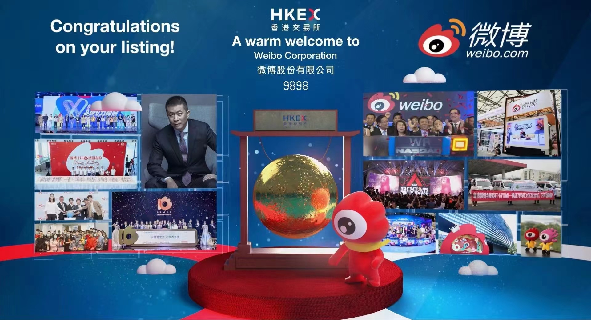 2021年12月8日,国内领先的社交媒体平台微博股份有限公司(“微博”或“公司”,9898.HK)于香港联交所主板成功挂牌上市。此次上市共募集资金3.85亿美元(绿鞋前)/4.43亿美元(假设绿鞋足额行使后),是2021年下半年来首个中概股回港第二上市。中金公司担任本项目的联席保荐人、联席全球协调人、联席账簿管理人及联席牵头经办人。