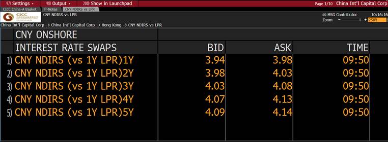 自本周起,中金公司香港子公司通过Bloomberg终端发布人民币LPR 非交割利率互换(LPR NDIRS)报价,成为境外市场首家提供LPR NDIRS双边连续可执行交易报价的机构。相关报价可在{CICH <GO>} 或{GDCO 7899 4 <GO>} 以及相关ticker的ALLQ页面查询。