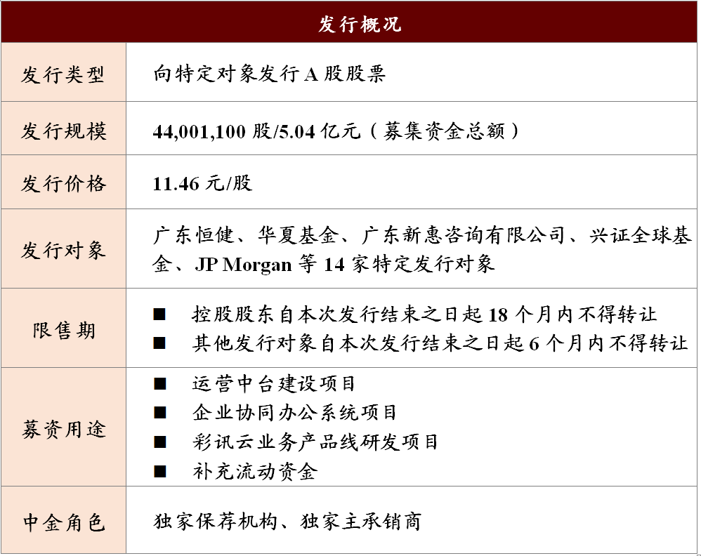 2021年6月15日,彩讯科技股份有限公司(以下简称“彩讯股份”或“公司”,股票代码:300634.SZ)完成向特定对象发行A股股票(以下简称“本次发行”或“本项目”),中金公司在本项目中担任独家保荐机构和独家主承销商。