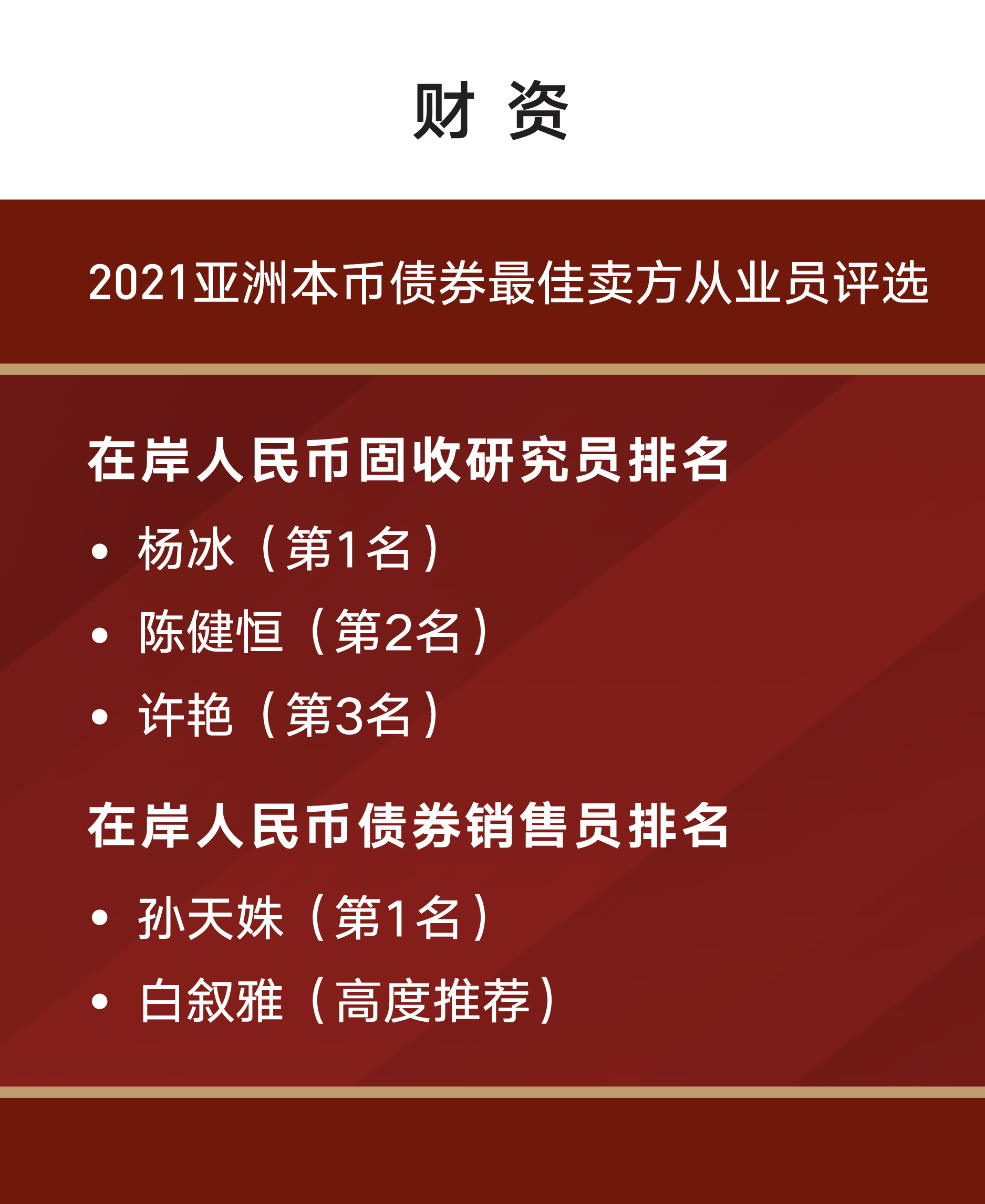 日前,《财资》(The Asset)公布了其本年度亚洲本币债券最佳卖方从业员排名 (Best Sellside Individuals Asian Currency Bonds 2021)评选的全部奖项结果。此次评选中《财资》研究团队调研了超过500位机构投资者,包括资产管理公司、保险公司、银行以及证券公司,最终评选出亚洲本币债券最佳卖方人员排名。中金凭借突出的专业实力赢得了投资者的充分肯定,并从激烈的评选中脱颖而出摘取“在岸人民币固收研究员”“在岸人民币债券销售员”桂冠等多个奖项。