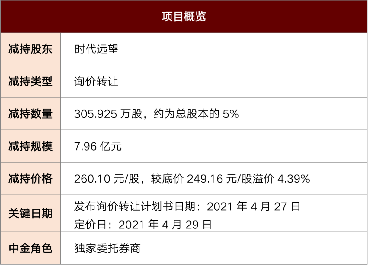 4月29日,北京华峰测控技术股份有限公司(“华峰测控”,688200.SH)股东成功完成询价减持的定价,此次询价减持出让方为中国时代远望科技有限公司(“时代远望”或“国有股东”),减持价格为260.10元/股,较底价249.16元/股溢价4.39%,减持规模为7.96亿元,中金公司担任本次股东询价减持的独家委托券商。本项目是首单国有股东科创板询价减持项目,也是截至目前减持规模占上市公司总股本最大的科创板询价减持项目。此次询价减持实现了较减持底价的溢价发行,并成功引入国际知名QFII、基金公司和优质私募投资机构。