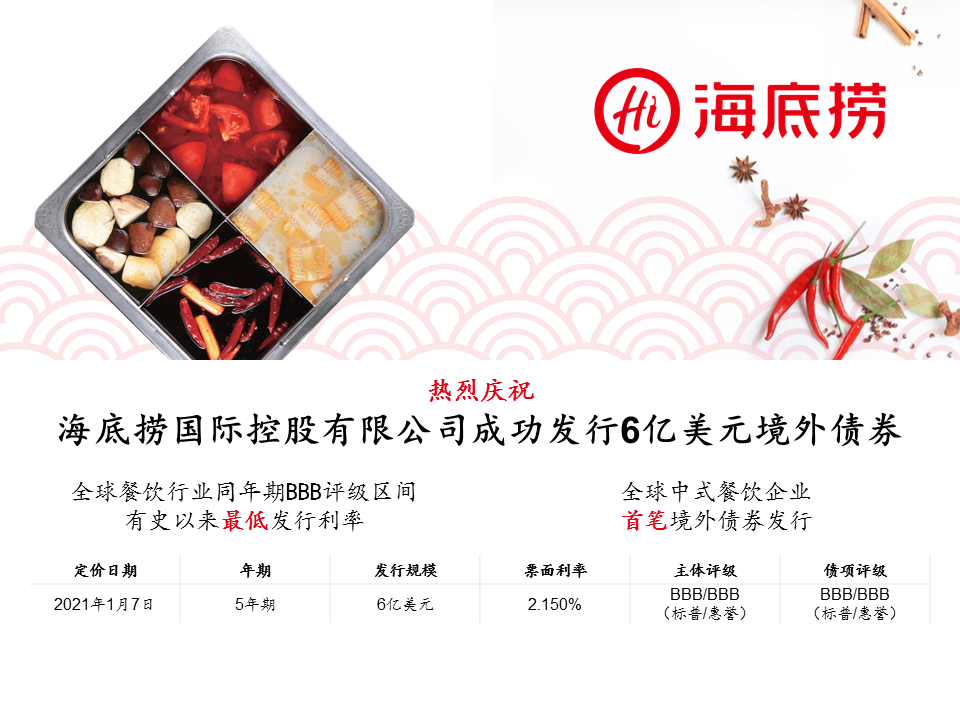 2021年1月7日,海底捞国际控股有限公司(“海底捞”,主体评级:BBB/BBB(标普/惠誉))成功定价发行6亿美元境外债券,债项评级BBB/BBB(标普/惠誉),期限为5年,票面利率为2.150%,发行价格99.854,收益率为2.181%。中金公司在本项目中担任联席全球协调人。