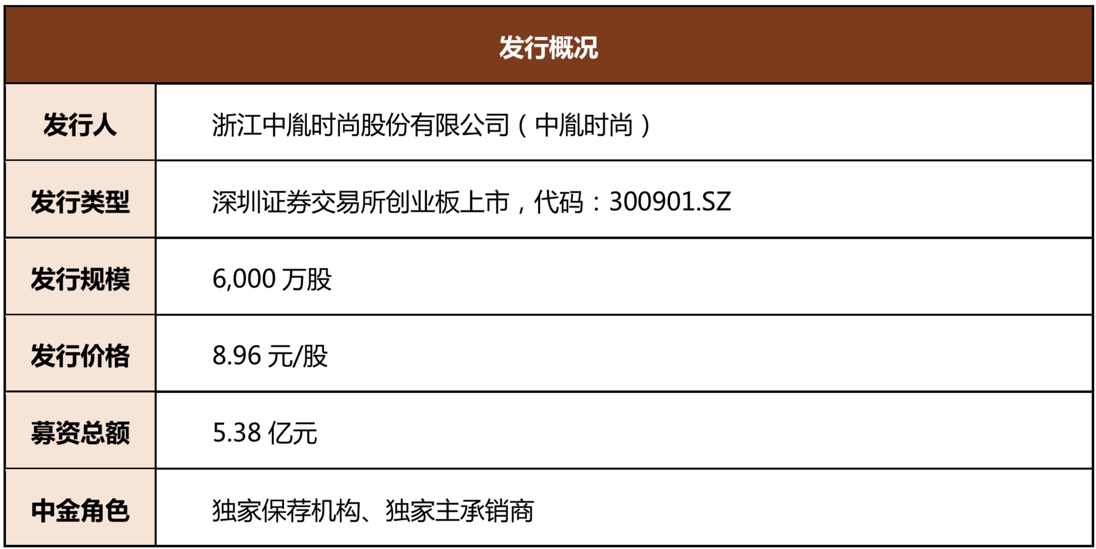 2020年10月29日,浙江中胤时尚股份有限公司(以下简称“中胤时尚”或“公司”,代码:300901.SZ)于深圳证券交易所创业板挂牌上市。中金公司在本项目中担任独家保荐机构和独家主承销商。