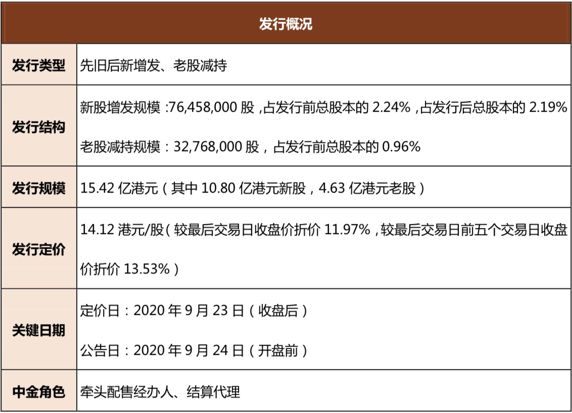 2020年9月24日,JS环球生活有限公司(以下简称“JS环球生活”或“公司”,股票代码“1691.HK”)实施先旧后新增发及老股减持项目。本次新股增发规模为76,458,000股新股、老股减持规模为32,768,000股(“本次发行”)。本次发行价为14.12港元/股,发行规模15.42亿港元(其中10.80亿港元新股,4.63亿港元老股)。中金公司担任本项目的牵头配售经办人及结算代理。