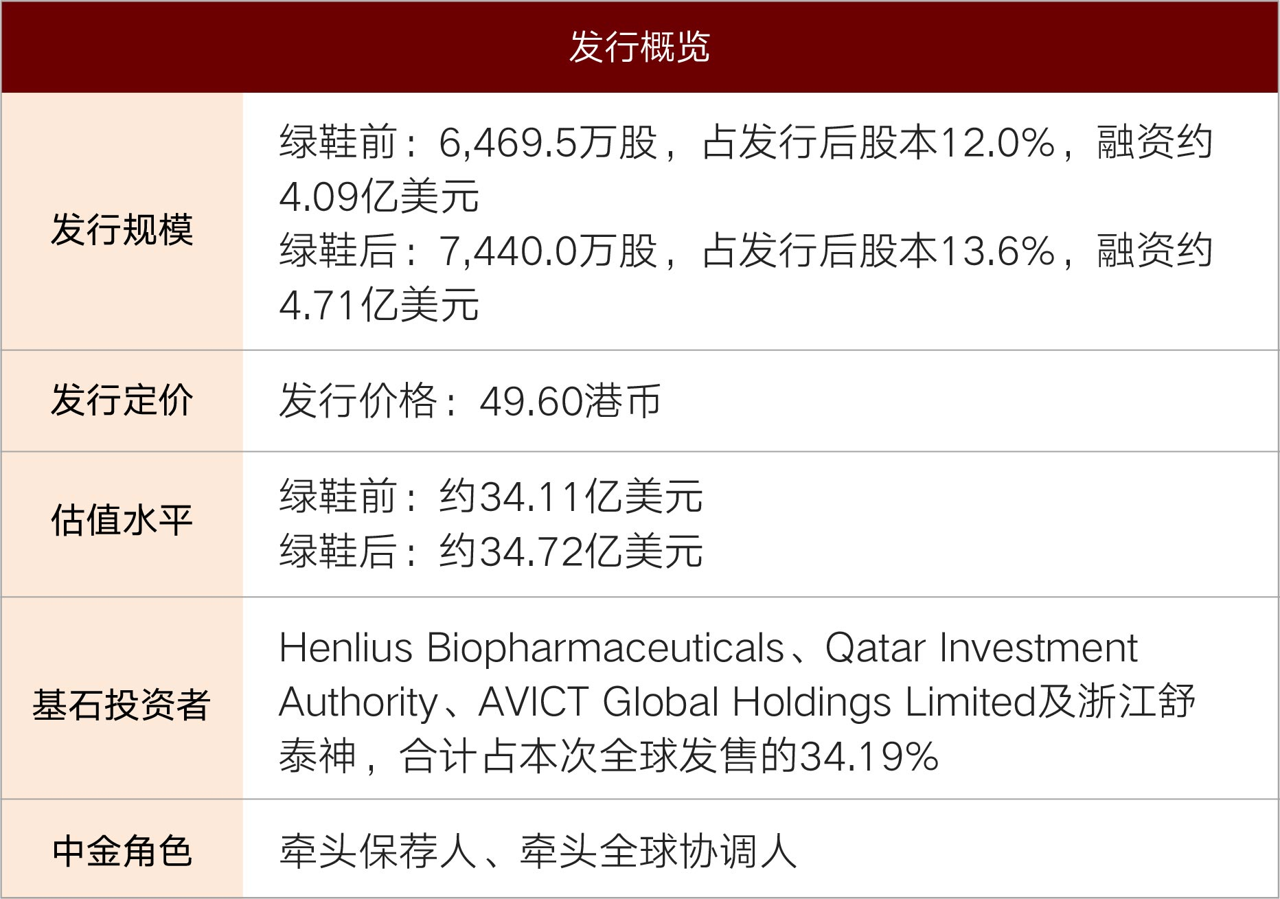 在香港市场环境波动的情况下,中金公司作为牵头保荐人、牵头全球协调人,充分挖掘投资者需求,成功为公司吸引了众多国际顶级长线基金、知名对冲基金、医药领域投资者和私人理财客户的参与,在基石投资者和国际配售中引入大量需求、贡献及簿记表现在投行中均居于首位,赢得了发行人的高度认可。